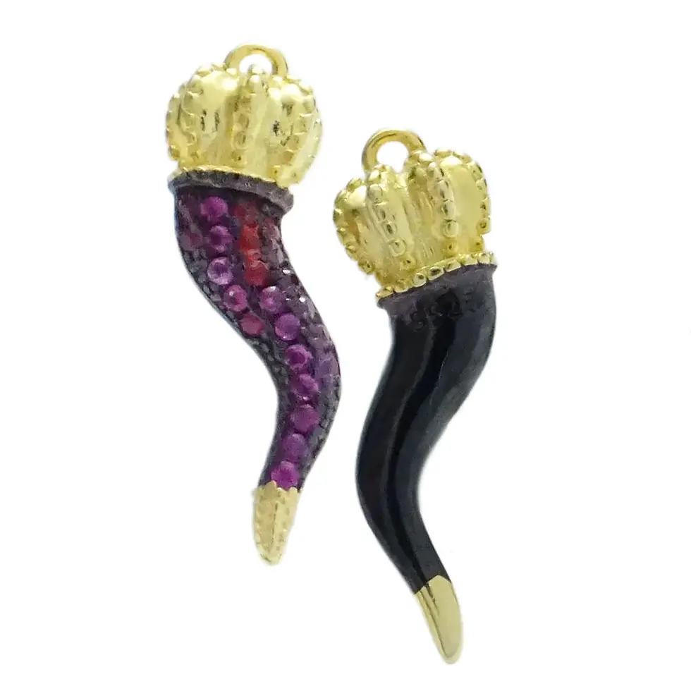Pendente Cornino Smaltato Nero Con Zirconi Fucsia Argento 925 19x6mm